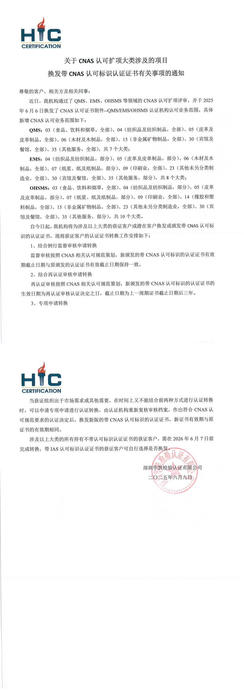 关于CNAS认可扩项大类涉及的项目换发带CNAS认可标识认证证书有关事项的通知